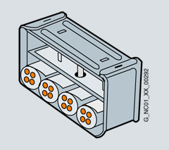 If, for example, pre-assembled cables are installed in a cable carrier in such a way that the connector would inhibit assembly, pre-assembled cables without assembled connectors can also be supplied (power and signal cables1)). In this case, the contacts of the cables are crimped and the connector enclosure is supplied separately. After installing the cables, the customer assembles the connector enclosure.