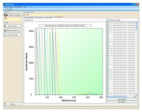 В ходе анализа сети PROFINET IRT важна не только информация о выдерживании времен циклов отдельными компонентами, но и время смещения отправки в рамках цикла. Т.е., поведение компонентов при взаимодействии с другими партнерами по связи. Смещения в рамках цикла могут отображаться в виде графиков кривых, позволяющих анализировать качество работы всей сети и распределение интервалов между ее узлами.