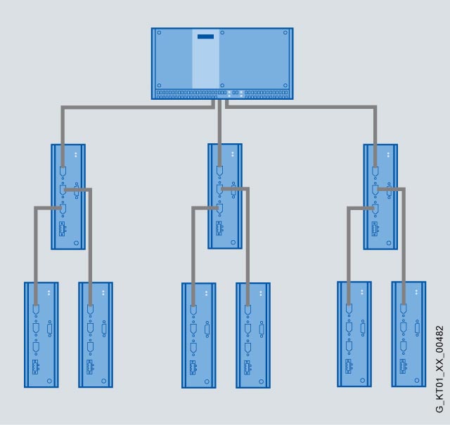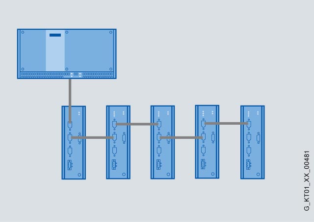 A maximum of 63 bus nodes can be connected. The maximum number of hops (point-to-point connections) from one bus node to any other is limited to 15. For this reason not more than 16 devices may be connected in series.