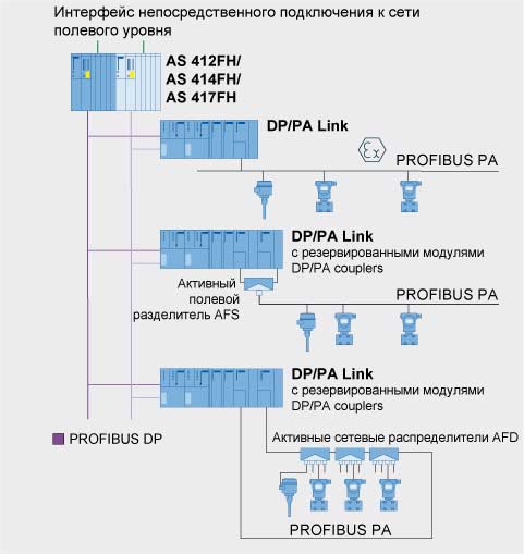 Для построения такой системы связи сегмент сети PROFIBUS PA подключается к двум модулям FDC 157-0 через активный полевой разделитель AFS. При этом модули FDC 157-0 могут устанавливаться в блок связи DP/PA Link с одним или двумя резервированными интерфейсными модулями IM 157. Разделитель AFS выполняет функции своеобразного коммутатора и обеспечивает автоматическое подключение линии PROFIBUS PA к активному модулю FDC 157-0 из данной резервированной пары. Гибкое модульное резервирование обепечивается группировкой устройств в различные PROFIBUS PA сегменты. Только одна PROFIBUS PA линия может подключаться через разделитель к одному DP/PA Link.  PROFIBUS PA кольцо не может быть реализовано на этих средствах.
