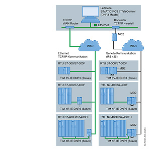 Widely distributed outstations (Remote Terminal Units) can be controlled and monitored with the DNP3 telecontrol protocol via serial or Ethernet TCP/IP communication links from a telecontrol center in SIMATIC PCS 7.