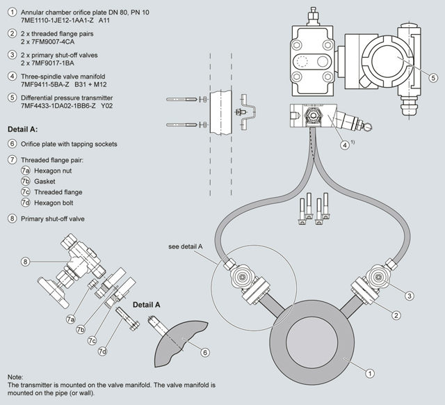 The orifice plate is installed between two flanges in the pipeline. Using compensation vessels (for steam) and initial shut-off valves, the differential pressure of the high-pressure side and low-pressure side is directed through differential pressure lines to a multiple valve manifold and on to the differential pressure transmitter. For media with extreme pressure and temperature fluctuations it makes sense to take an additional measurement of the pressure and temperature in order to correct the flow signal of the transmitter in a subsequent correction computer.