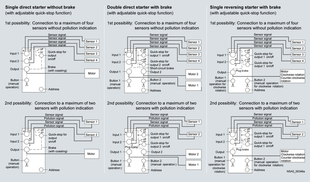 Версии сдвоенной станции прямого пуска и одинарного реверсивного пуска оснащены встроенной функцией торможения, то есть, как только выходной сигнал устанавливается на «0», двигатель останавливается.